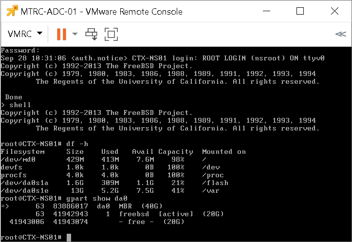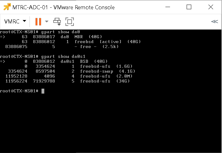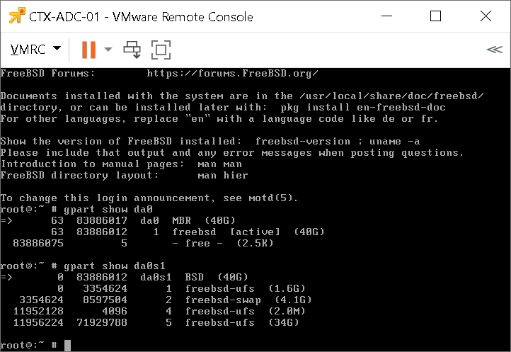 - Run the gpart show da0 command. Here, we can see the total size of 40GB (20GB default size + 20GB increase we did earlier).
