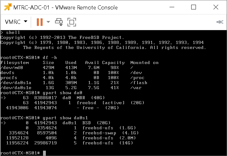 - Run the gpart show da0s1 command. Here, we can see the size of 34GB (14GB default size + 20GB increase we did earlier) for /var.
