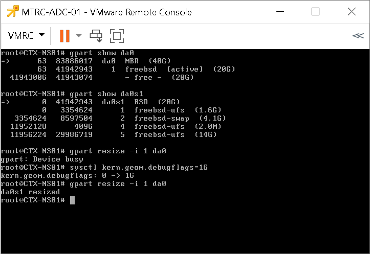 - We will first resize da0 by running the command gpart resize -i 1 da0.