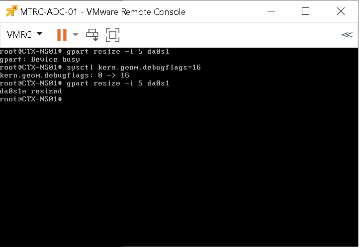 - Then, we will first resize da0s1 by running the command gpart resize -i 5 da0s1.