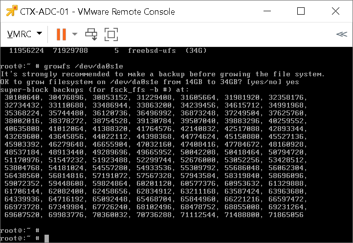 - Run command growfs /dev/da0s1e and confirm with yes.