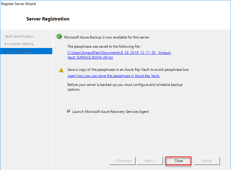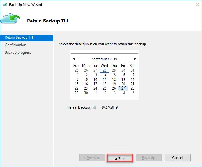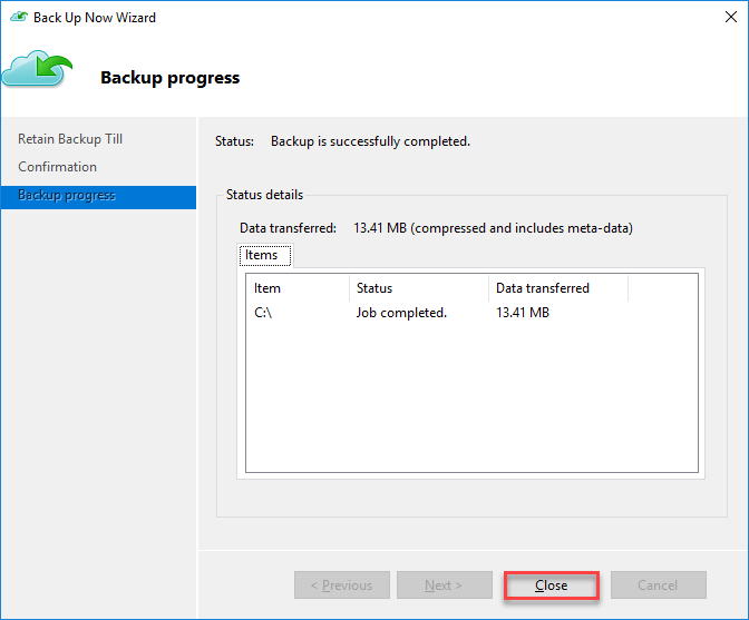 - Click Close to close the wizard. If you do this before the backup finishes, the wizard continues to run in the background.