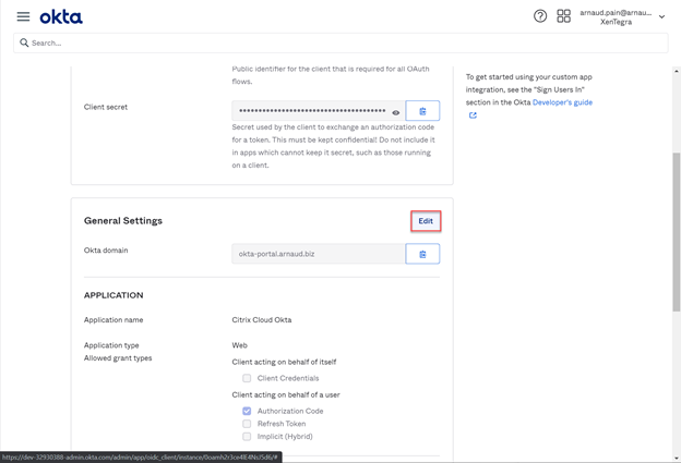 • From the Okta application configuration page, in General Settings, click Edit.