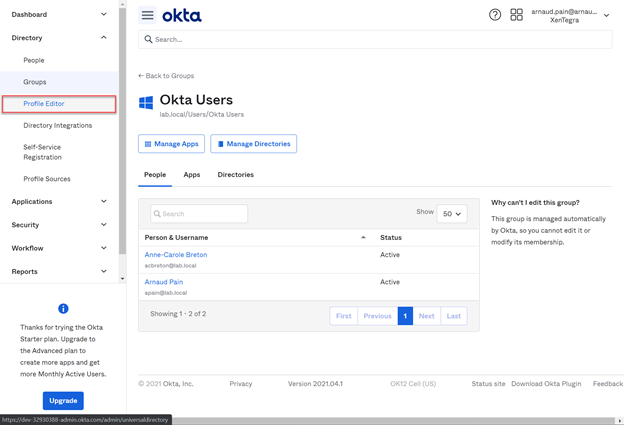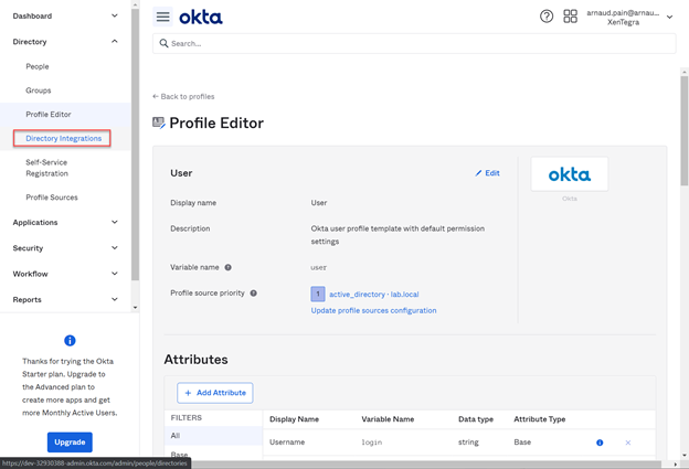 • From the Okta console menu, select Directory > Profile Editor.