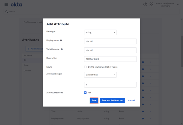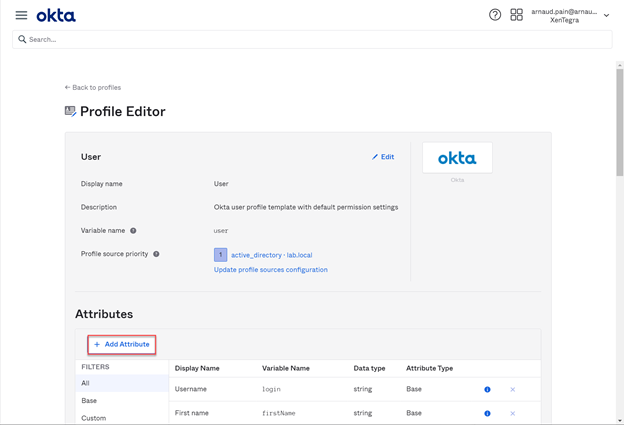 • Locate the Okta user profile and select Profile. Under Attributes, select Add attribute.