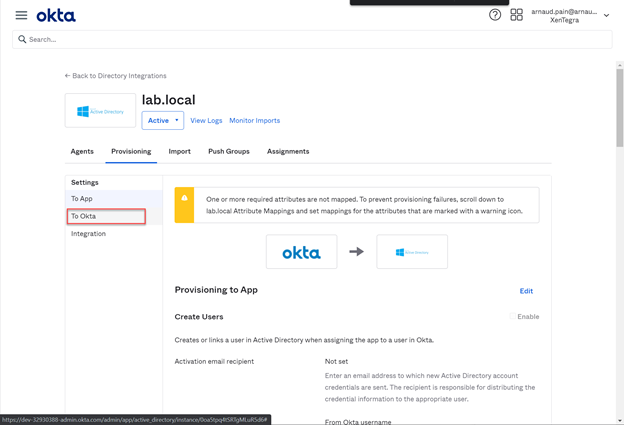• From the Okta console, select Directory > Directory Integrations.
