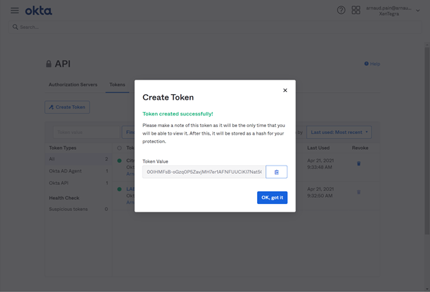 When you create the API token, make a note of the token value (for example, copy the value temporarily to a plain text document). Okta displays this value only once, so you might create the token just before you perform the steps in Connect Citrix Cloud to your Okta organization.