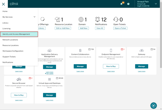 • From the Citrix Cloud menu, select Identity and Access Management.